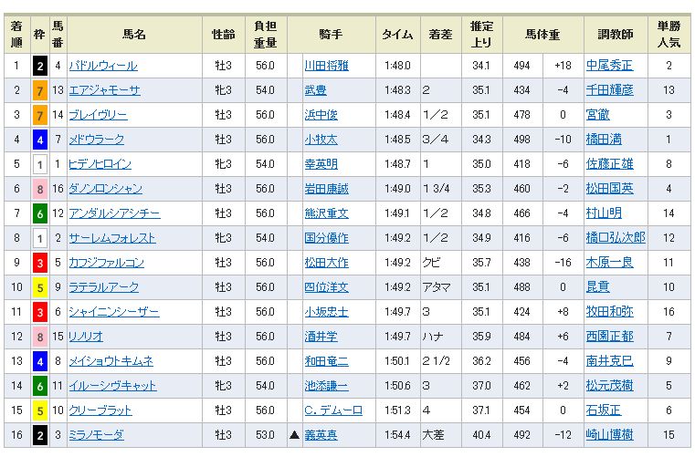 15 4 07 アユサン .牝4 丸山元気 1.51.6 1 1/4馬身 55.0 488(+2) 手塚 貴久