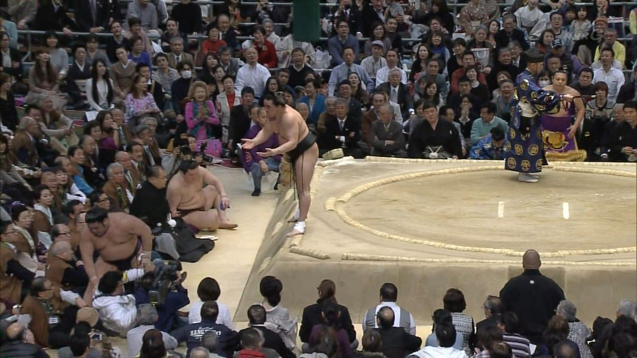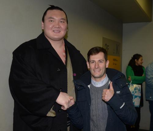 デムーロは土俵の方を見ていて、ルメールは花道を引き上げていく照ノ富士を見てるね。