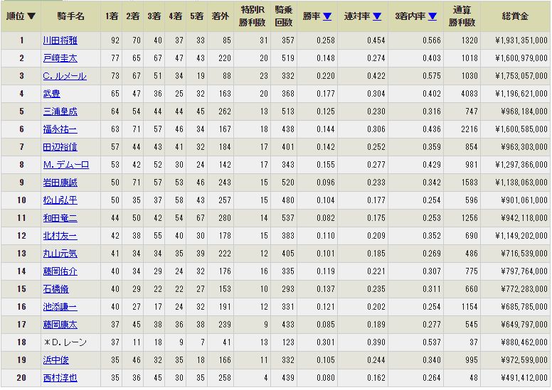 ルメールは上位にこそいるが圧倒的一番人気馬に乗れるんだからもっと勝っていないとだめ