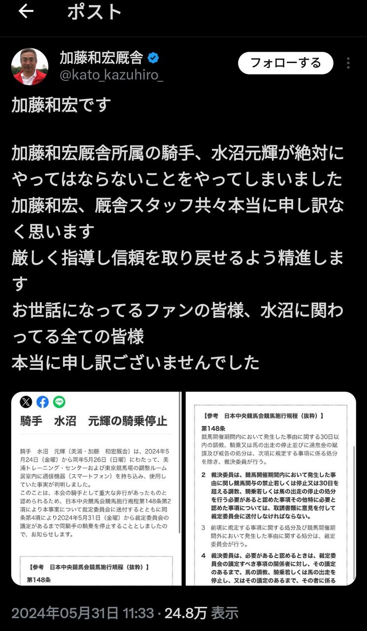 このことは、本会の騎手として重大な非行があったものと認められるため、日本中央競馬会競馬施行規程第148条第2項により本事案について裁定委員会に送付するとともに同条第4項により2024年5月31日(金曜)から裁定委員会の議定があるまで同騎手の騎乗を停止することとしましたので、お知らせします。